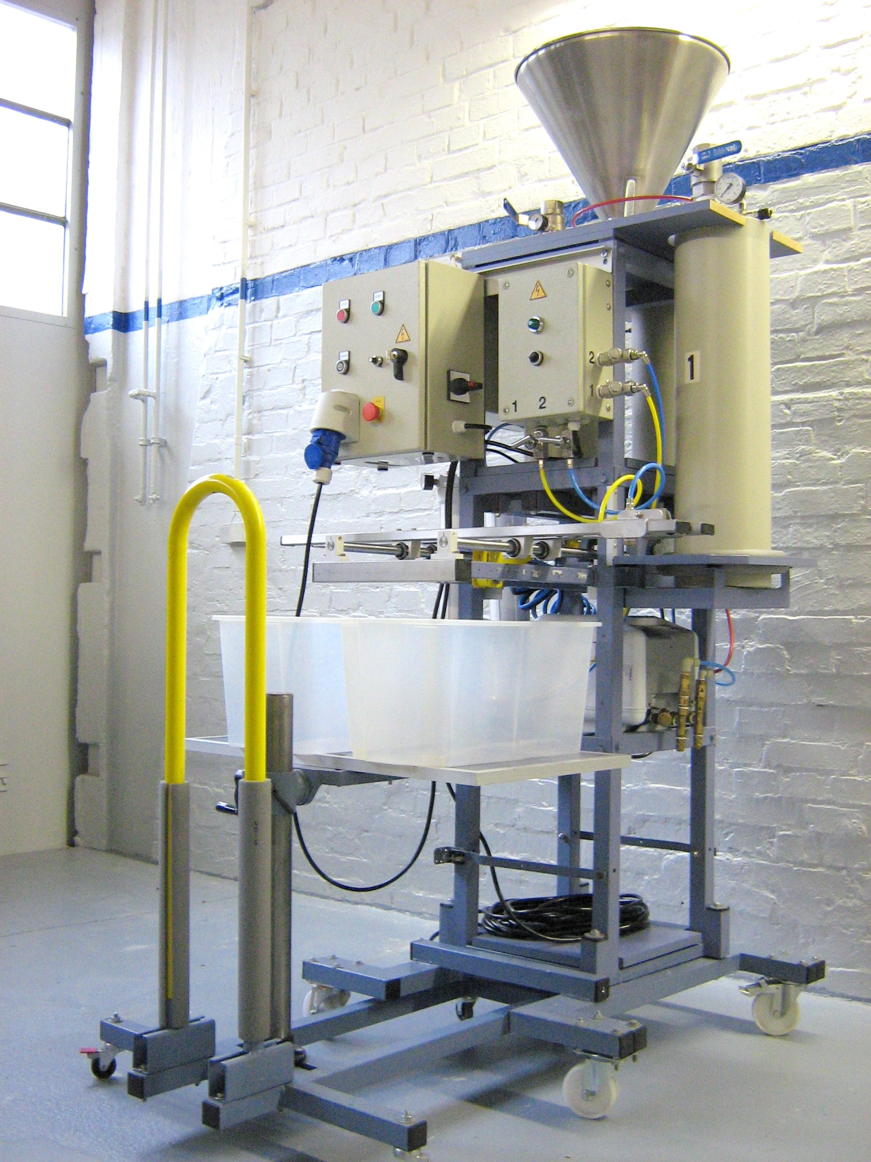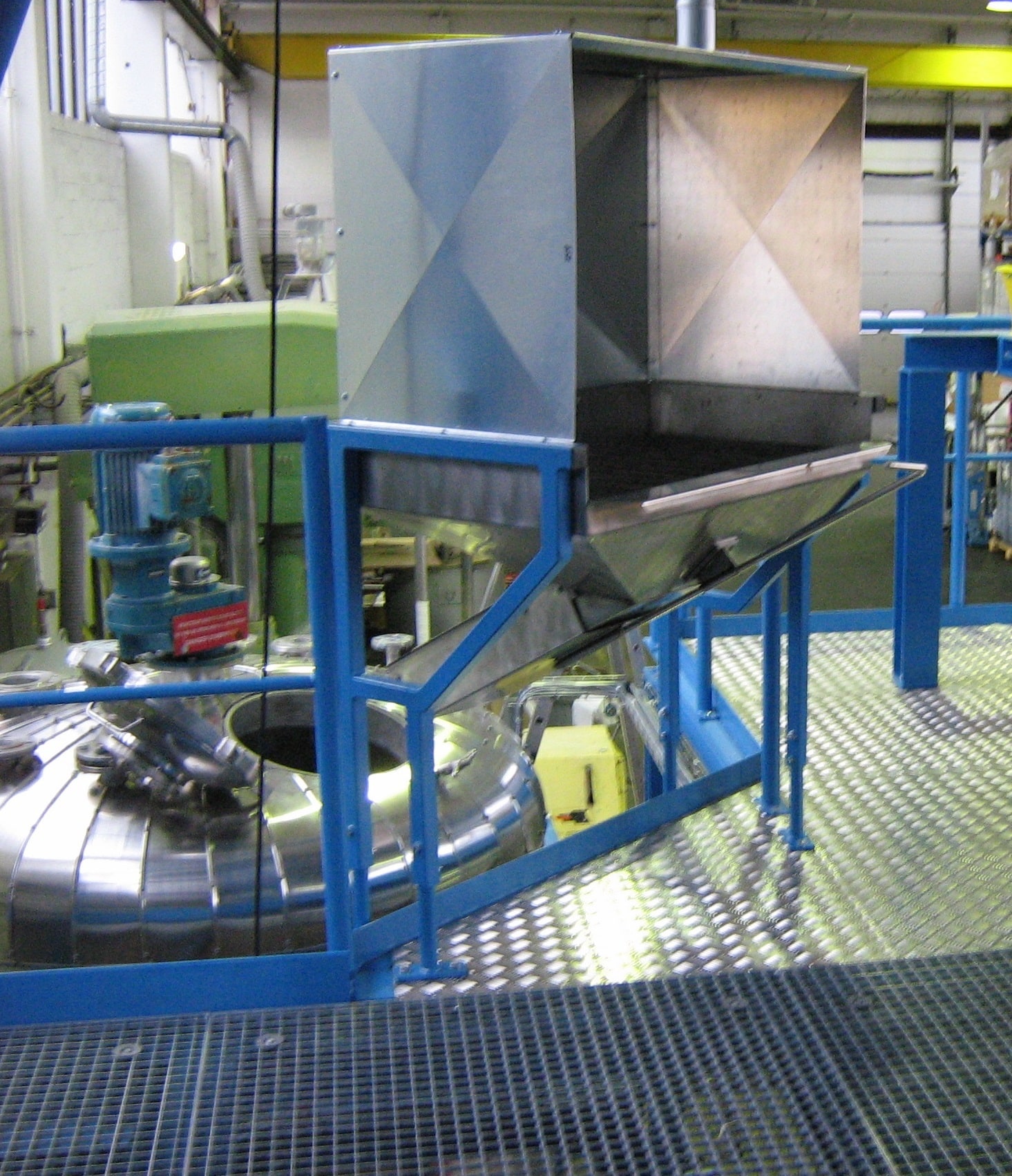 | Mobile Schwingförderrinne in Sonderausführung, Förderung und Dosierung von Pigmentpulver in unterschiedlich vorhandene Rührbehälter (Ex-Bereich)