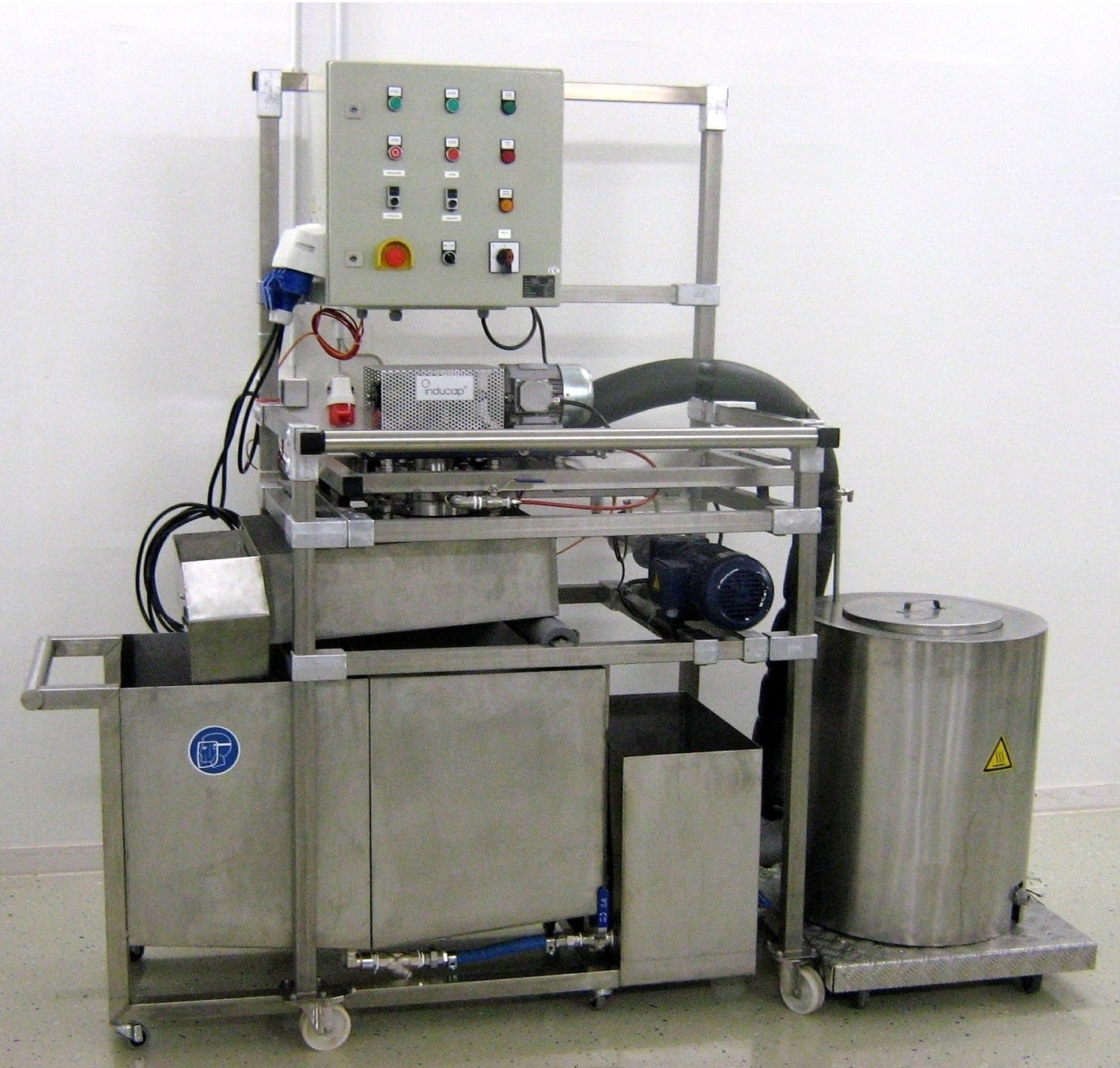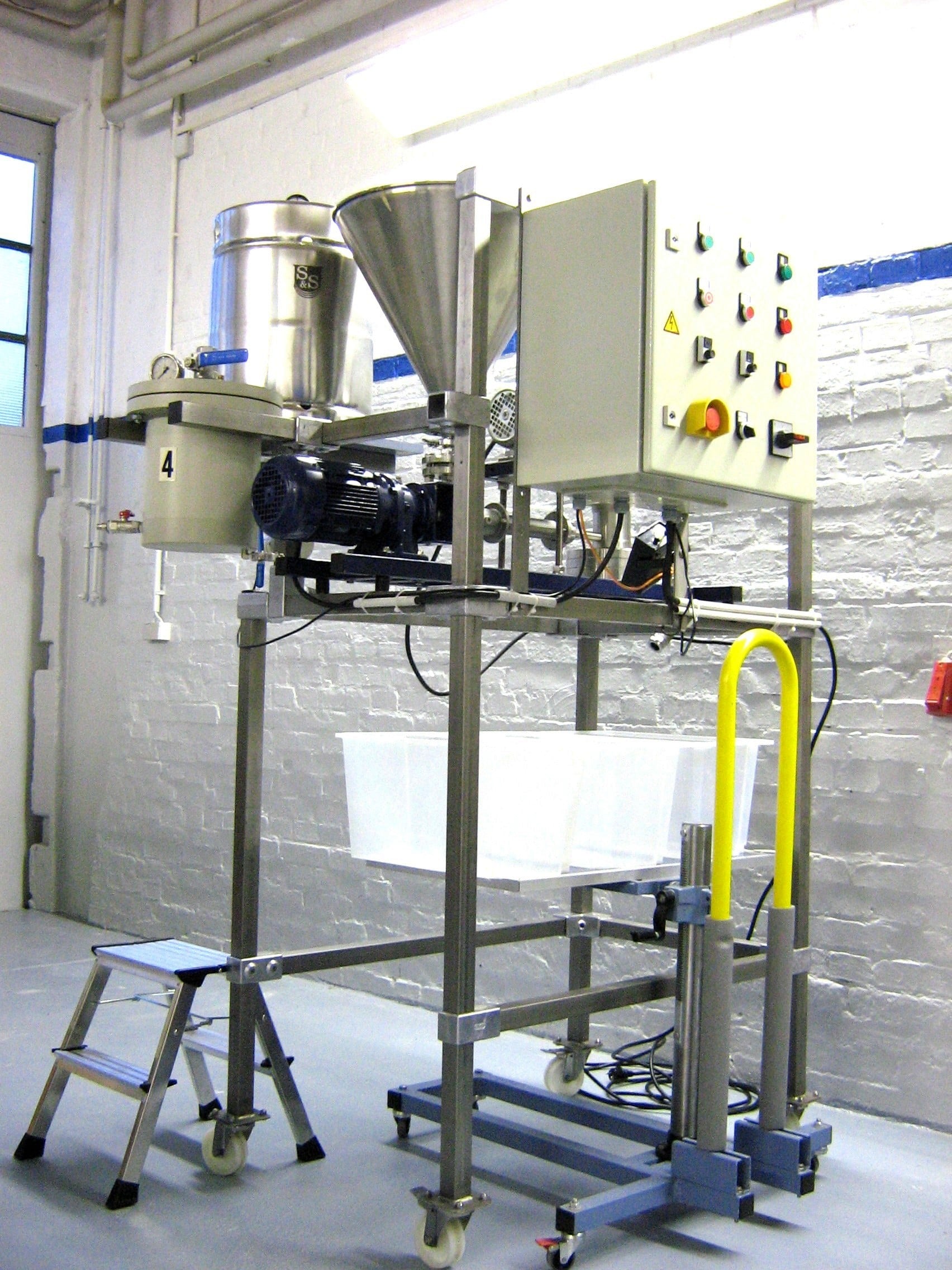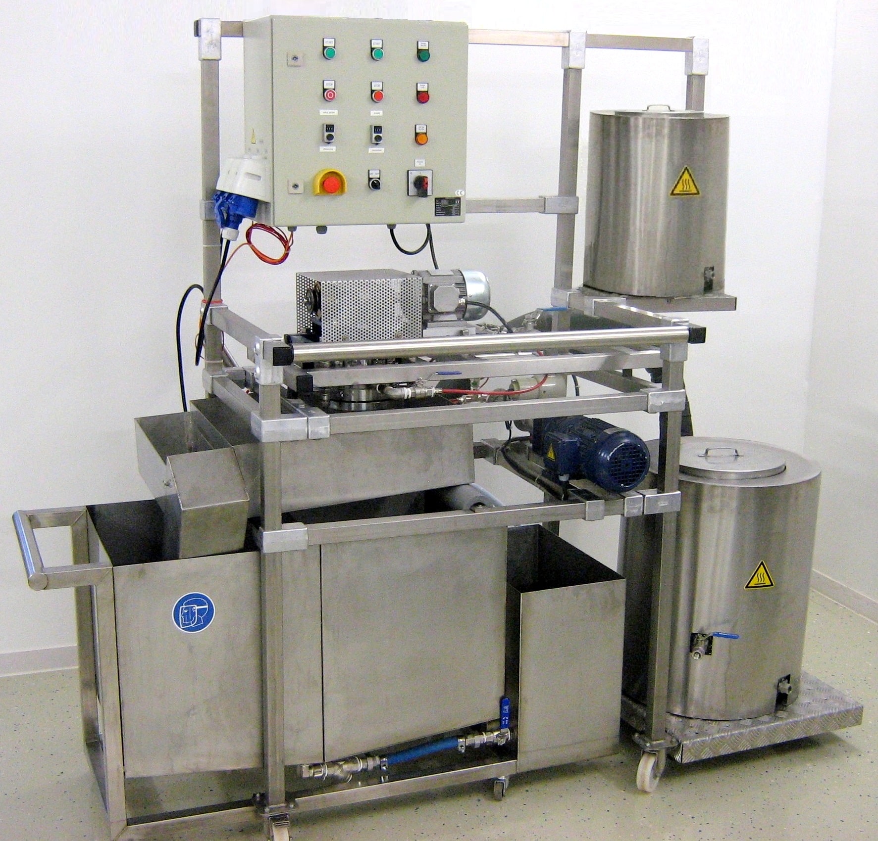 | Mobile Technikumsanlage in Sonderausführung zur Herstellung von Mikrokugeln aus Schmelzen bis + 100 °C mit Aushärtung in Kühlflüssigkeit und nachfolgener Separierung